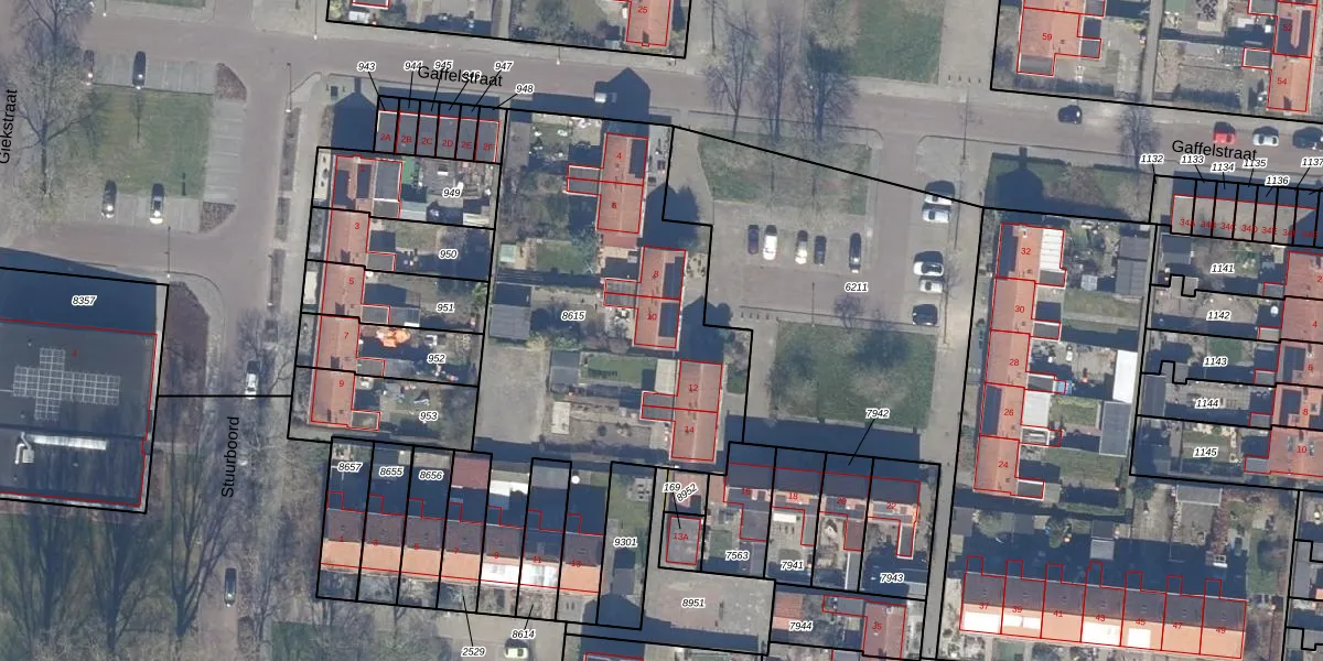 Het perceel waarop Gaffelstraat 10 staat heeft een oppervlakte van 2056 m². Dit is een zeer groot perceel. De perceeloppervlakte wordt geregistreerd door het Kadaster. Gedetailleerde informatie over de maten van dit perceel kunt u vinden in het rapport Kadastrale kaart met maatvoering van Gaffelstraat 10.