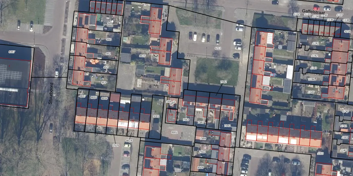 Het perceel waarop Gaffelstraat 14 staat heeft een oppervlakte van 2056 m². Dit is een zeer groot perceel. De perceeloppervlakte wordt geregistreerd door het Kadaster. Gedetailleerde informatie over de maten van dit perceel kunt u vinden in het rapport Kadastrale kaart met maatvoering van Gaffelstraat 14.