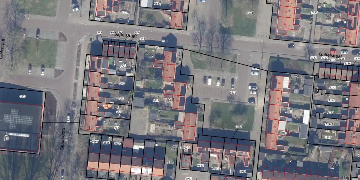 Gaffelstraat 8 is gelegen op kadastraal perceel DTN01A8615. Deze kadastrale aanduiding is uniek en wordt gebruikt door het Kadaster om eigendomsrechten en andere zakelijke rechten vast te leggen. Het perceel maakt onderdeel uit van de kadastrale gemeente Dronten.
