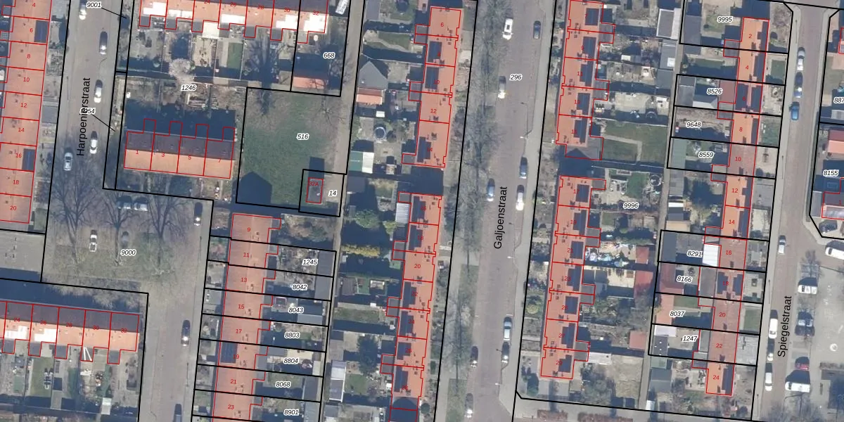 Het perceel waarop Galjoenstraat 16 staat heeft een oppervlakte van 5567 m². Dit is een zeer groot perceel. De perceeloppervlakte wordt geregistreerd door het Kadaster. Gedetailleerde informatie over de maten van dit perceel kunt u vinden in het rapport Kadastrale kaart met maatvoering van Galjoenstraat 16.