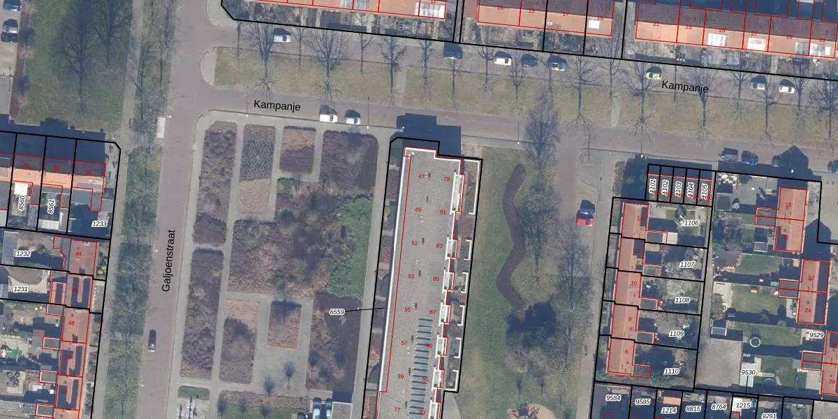 Het perceel waarop Galjoenstraat 49 staat heeft een oppervlakte van 1563 m². Dit is een zeer groot perceel. De perceeloppervlakte wordt geregistreerd door het Kadaster. Gedetailleerde informatie over de maten van dit perceel kunt u vinden in het rapport Kadastrale kaart met maatvoering van Galjoenstraat 49.