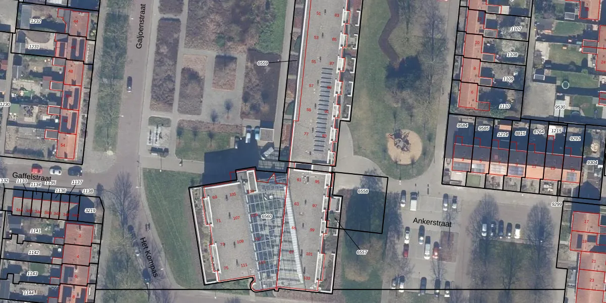 Het perceel waarop Galjoenstraat 59 staat heeft een oppervlakte van 1563 m². Dit is een zeer groot perceel. De perceeloppervlakte wordt geregistreerd door het Kadaster. Gedetailleerde informatie over de maten van dit perceel kunt u vinden in het rapport Kadastrale kaart met maatvoering van Galjoenstraat 59.