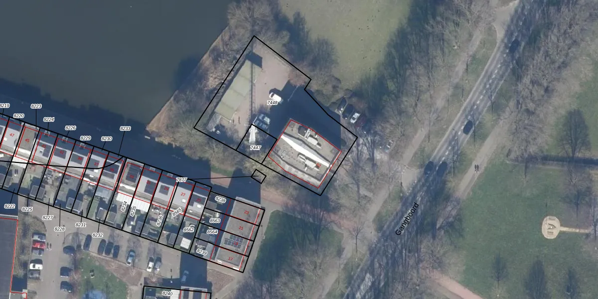 Het perceel waarop Gangboord 62 staat heeft een oppervlakte van 1341 m². Dit is een zeer groot perceel. De perceeloppervlakte wordt geregistreerd door het Kadaster. Gedetailleerde informatie over de maten van dit perceel kunt u vinden in het rapport Kadastrale kaart met maatvoering van Gangboord 62.