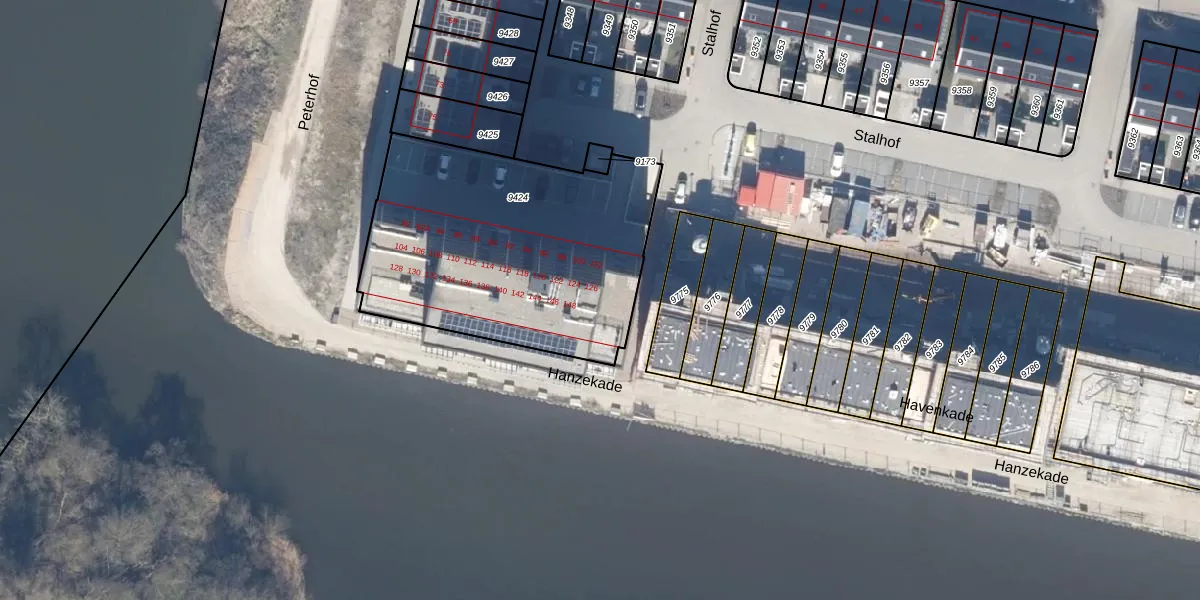 Het perceel waarop Hanzekade 112 staat heeft een oppervlakte van 1410 m². Dit is een zeer groot perceel. De perceeloppervlakte wordt geregistreerd door het Kadaster. Gedetailleerde informatie over de maten van dit perceel kunt u vinden in het rapport Kadastrale kaart met maatvoering van Hanzekade 112.