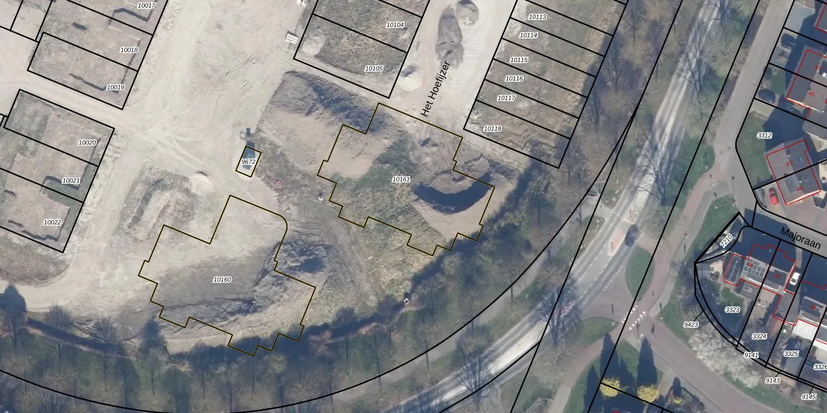 Het perceel waarop Het Hoefijzer 45 staat heeft een oppervlakte van 915 m². Dit is een groot perceel. De perceeloppervlakte wordt geregistreerd door het Kadaster. Gedetailleerde informatie over de maten van dit perceel kunt u vinden in het rapport Kadastrale kaart met maatvoering van Het Hoefijzer 45.