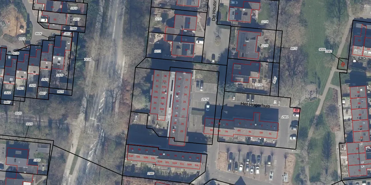Het perceel waarop Het Hogerhuis 21 staat heeft een oppervlakte van 1580 m². Dit is een zeer groot perceel. De perceeloppervlakte wordt geregistreerd door het Kadaster. Gedetailleerde informatie over de maten van dit perceel kunt u vinden in het rapport Kadastrale kaart met maatvoering van Het Hogerhuis 21.