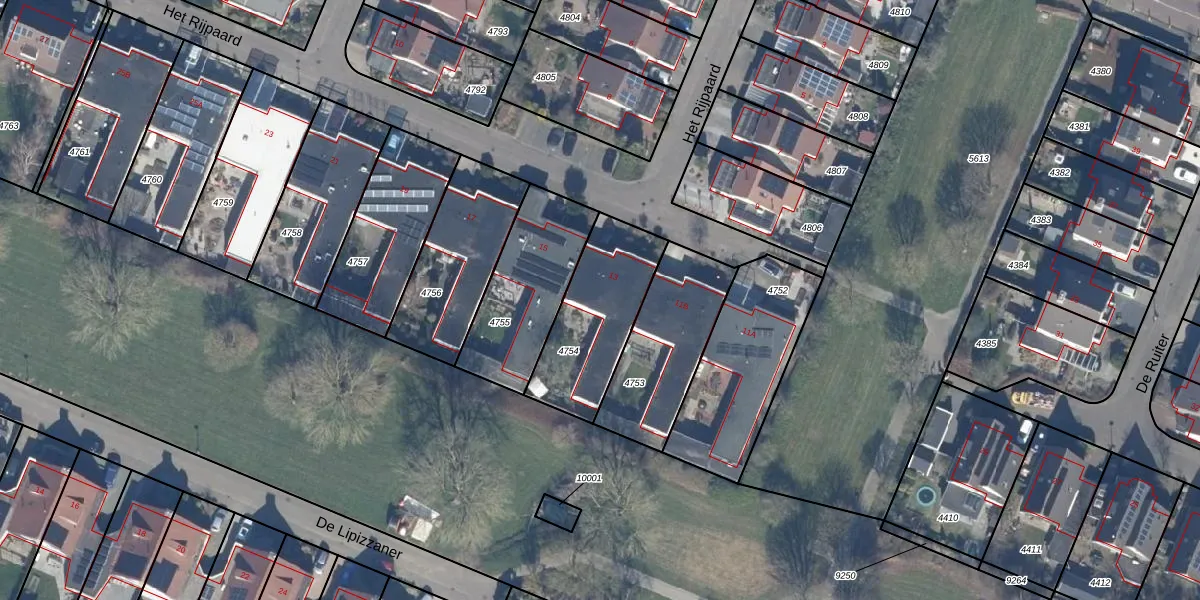 Het perceel waarop Het Rijpaard 13 staat heeft een oppervlakte van 412 m². Dit is een groot perceel. De perceeloppervlakte wordt geregistreerd door het Kadaster. Gedetailleerde informatie over de maten van dit perceel kunt u vinden in het rapport Kadastrale kaart met maatvoering van Het Rijpaard 13.