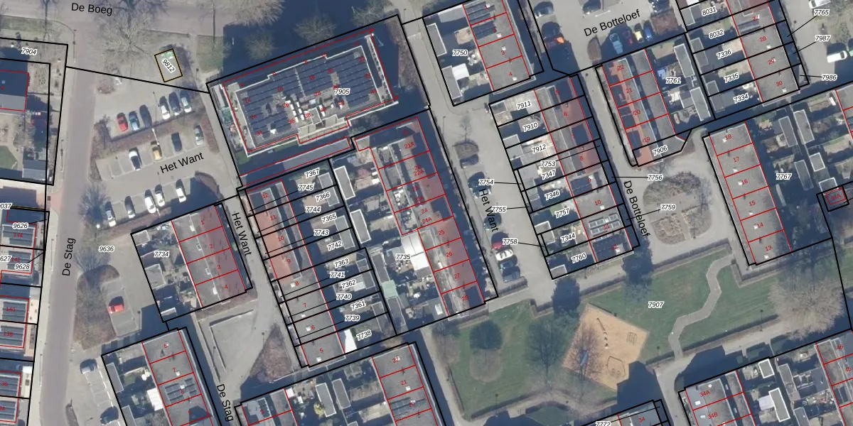 Het perceel waarop Het Want 24 staat heeft een oppervlakte van 1204 m². Dit is een zeer groot perceel. De perceeloppervlakte wordt geregistreerd door het Kadaster. Gedetailleerde informatie over de maten van dit perceel kunt u vinden in het rapport Kadastrale kaart met maatvoering van Het Want 24.