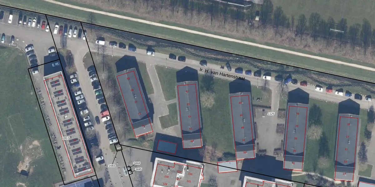 Het perceel waarop Ir. H. van Hartenstraat 57 staat heeft een oppervlakte van 1,1 ha. Dit is een zeer groot perceel. De perceeloppervlakte wordt geregistreerd door het Kadaster. Gedetailleerde informatie over de maten van dit perceel kunt u vinden in het rapport Kadastrale kaart met maatvoering van Ir. H. van Hartenstraat 57.