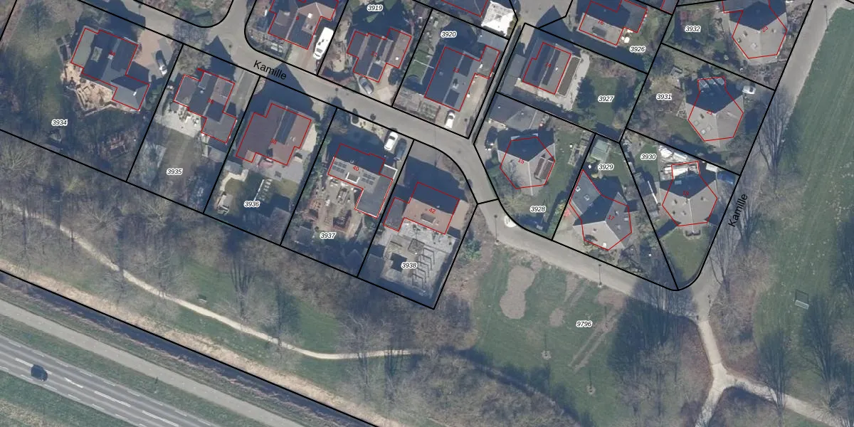 Het perceel waarop Kamille 42 staat heeft een oppervlakte van 641 m². Dit is een groot perceel. De perceeloppervlakte wordt geregistreerd door het Kadaster. Gedetailleerde informatie over de maten van dit perceel kunt u vinden in het rapport Kadastrale kaart met maatvoering van Kamille 42.