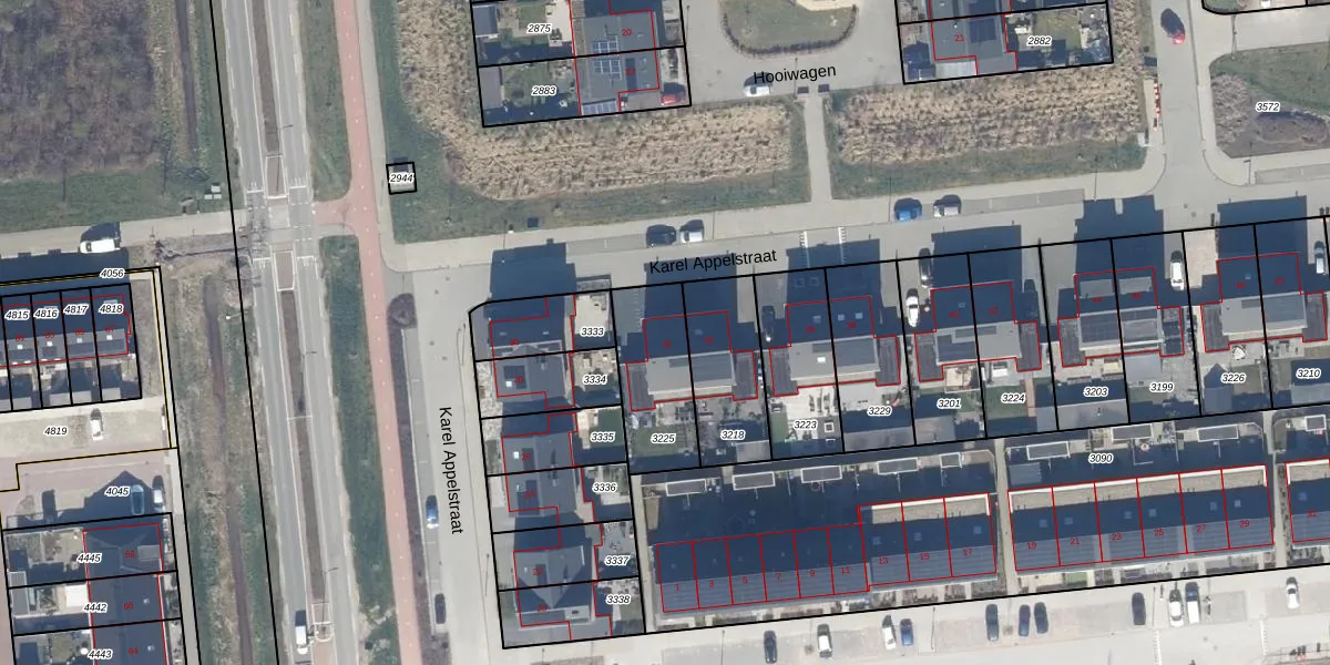 Het perceel waarop Karel Appelstraat 32 staat heeft een oppervlakte van 303 m². Dit is een groot perceel. De perceeloppervlakte wordt geregistreerd door het Kadaster. Gedetailleerde informatie over de maten van dit perceel kunt u vinden in het rapport Kadastrale kaart met maatvoering van Karel Appelstraat 32.