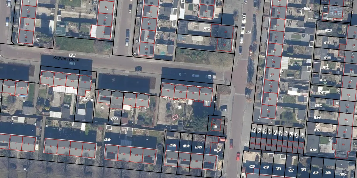 Het perceel waarop Karveelstraat 30 staat heeft een oppervlakte van 5079 m². Dit is een zeer groot perceel. De perceeloppervlakte wordt geregistreerd door het Kadaster. Gedetailleerde informatie over de maten van dit perceel kunt u vinden in het rapport Kadastrale kaart met maatvoering van Karveelstraat 30.