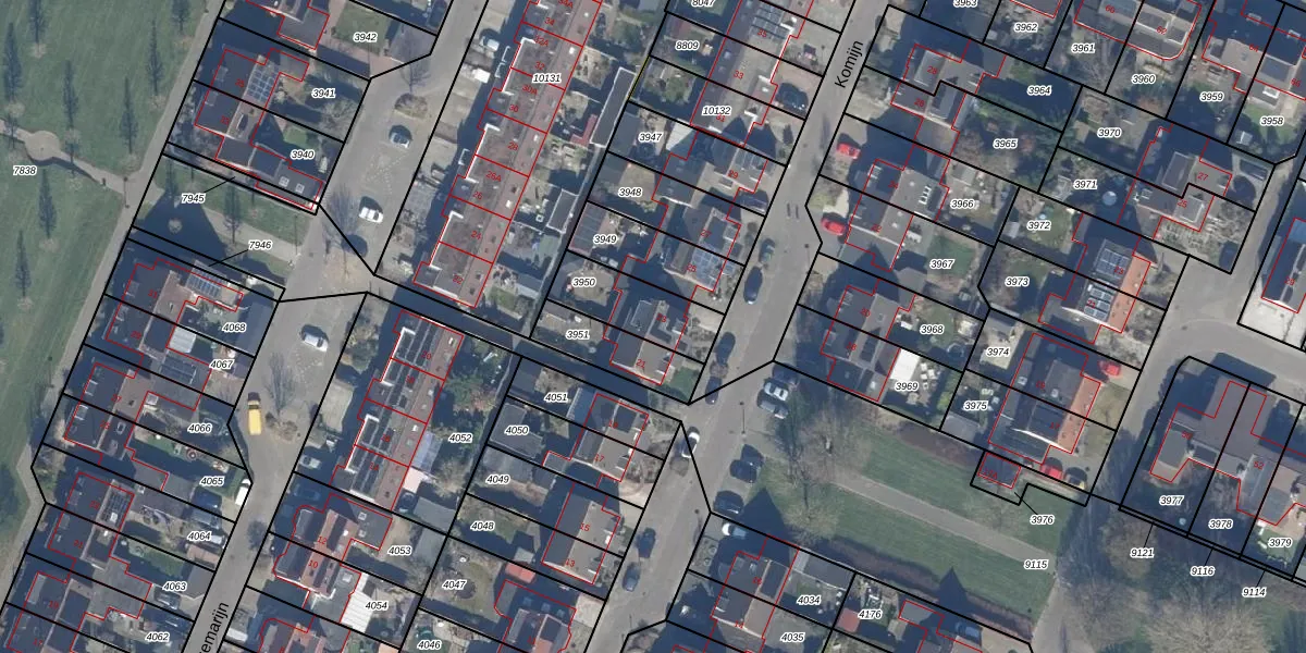 Het perceel waarop Komijn 23 staat heeft een oppervlakte van 215 m². Dit is een middelgroot perceel. De perceeloppervlakte wordt geregistreerd door het Kadaster. Gedetailleerde informatie over de maten van dit perceel kunt u vinden in het rapport Kadastrale kaart met maatvoering van Komijn 23.