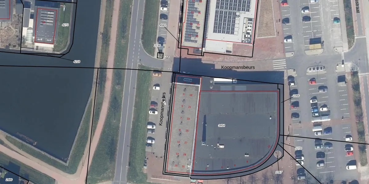 Het perceel waarop Koopmansbeurs 1 staat heeft een oppervlakte van 2973 m². Dit is een zeer groot perceel. De perceeloppervlakte wordt geregistreerd door het Kadaster. Gedetailleerde informatie over de maten van dit perceel kunt u vinden in het rapport Kadastrale kaart met maatvoering van Koopmansbeurs 1.