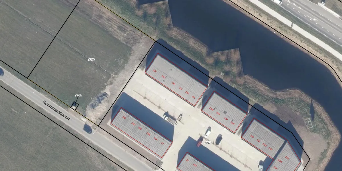 Het perceel waarop Koornmarktpoort 23-H staat heeft een oppervlakte van 7240 m². Dit is een zeer groot perceel. De perceeloppervlakte wordt geregistreerd door het Kadaster. Gedetailleerde informatie over de maten van dit perceel kunt u vinden in het rapport Kadastrale kaart met maatvoering van Koornmarktpoort 23-H.