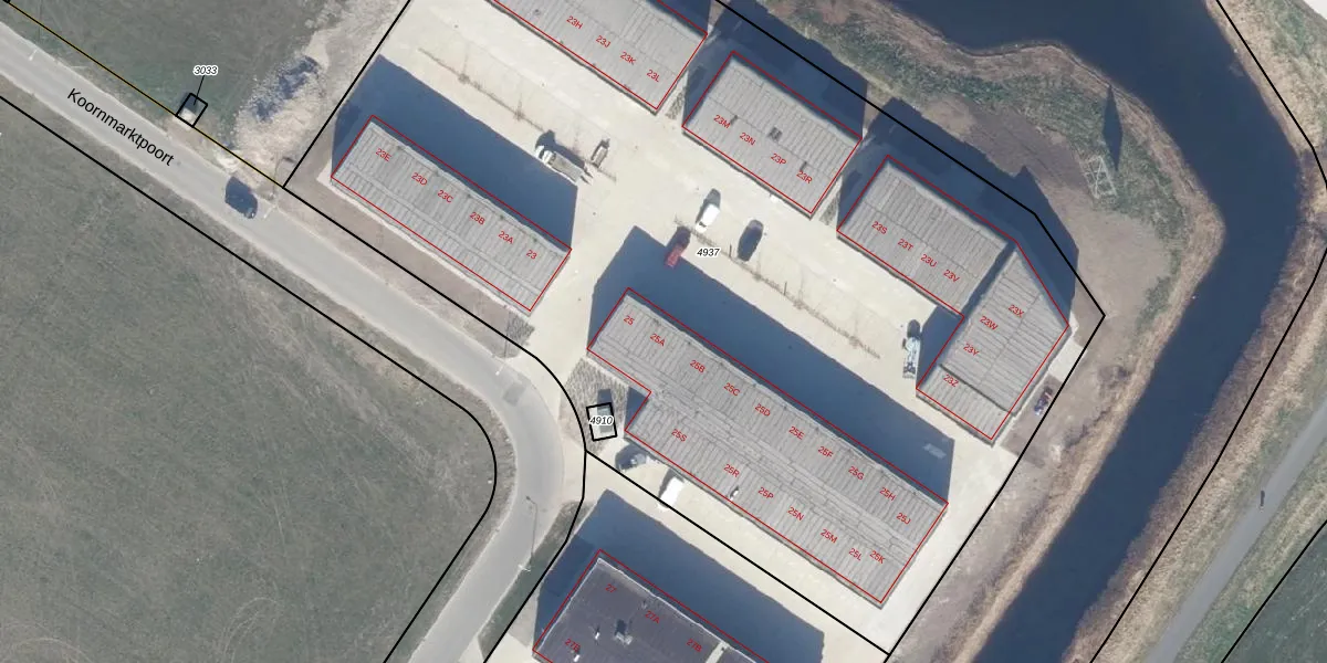 Het perceel waarop Koornmarktpoort 25-A staat heeft een oppervlakte van 7240 m². Dit is een zeer groot perceel. De perceeloppervlakte wordt geregistreerd door het Kadaster. Gedetailleerde informatie over de maten van dit perceel kunt u vinden in het rapport Kadastrale kaart met maatvoering van Koornmarktpoort 25-A.
