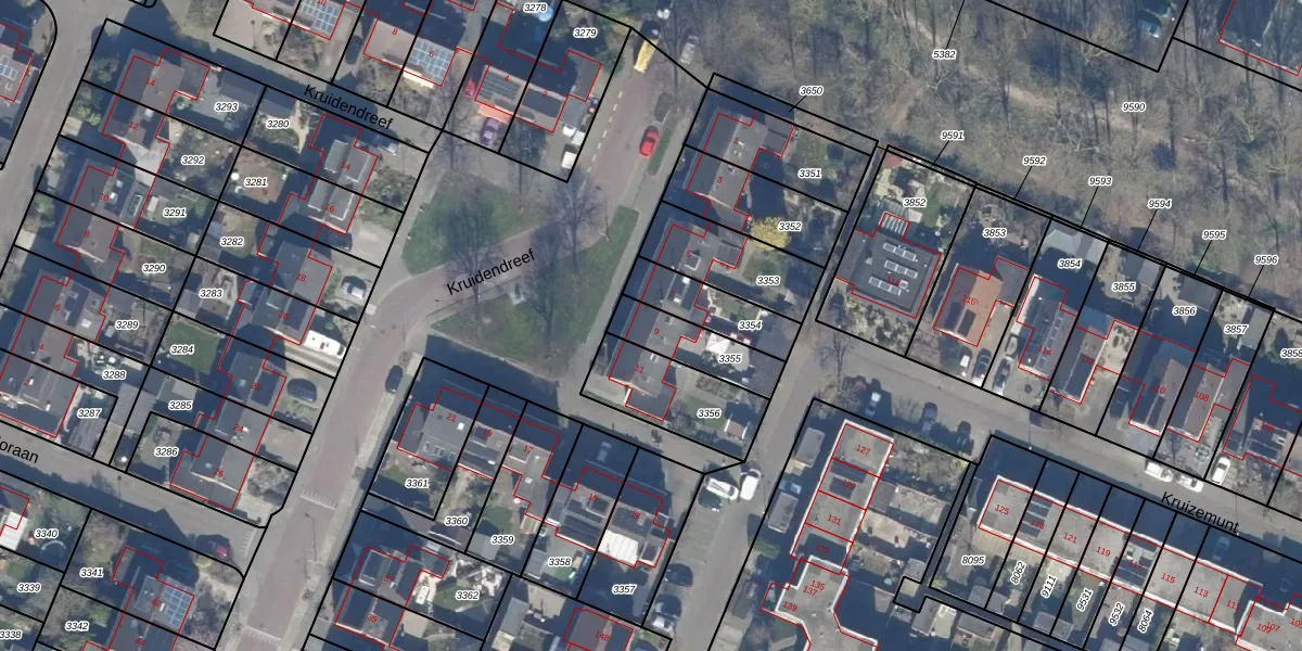 Kruidendreef 9 is gelegen op kadastraal perceel DTN01A3355. Deze kadastrale aanduiding is uniek en wordt gebruikt door het Kadaster om eigendomsrechten en andere zakelijke rechten vast te leggen. Het perceel maakt onderdeel uit van de kadastrale gemeente Dronten.