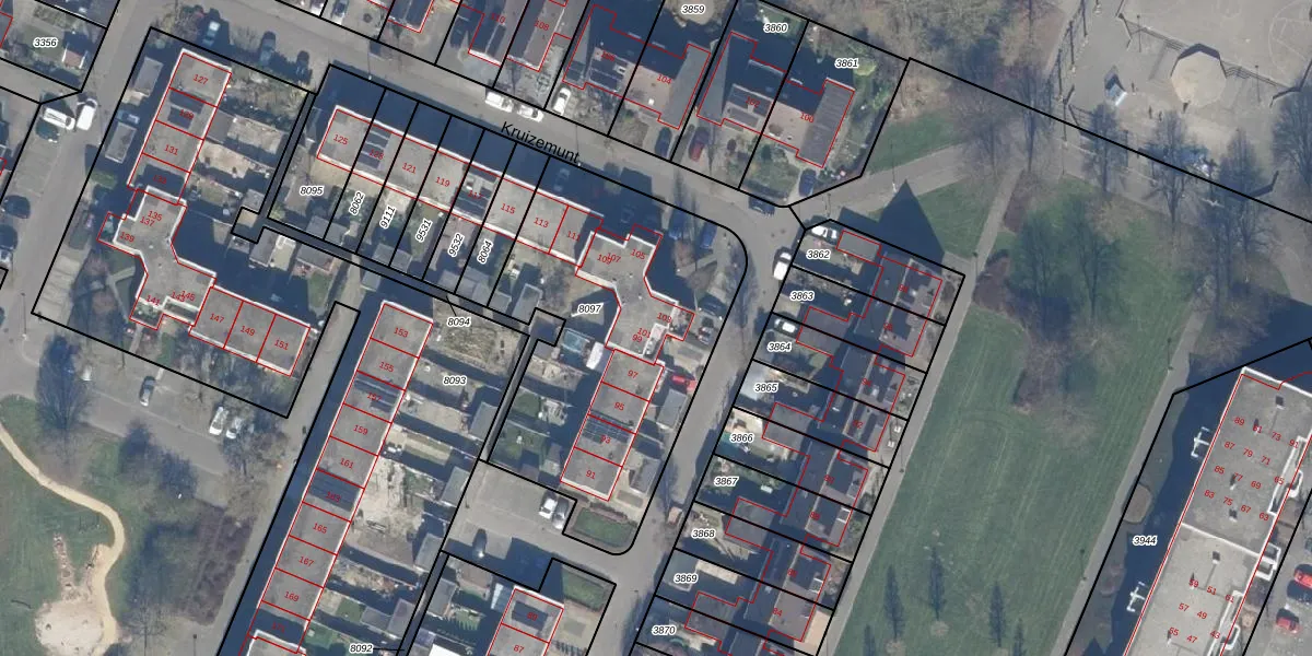 Het perceel waarop Kruizemunt 101 staat heeft een oppervlakte van 1447 m². Dit is een zeer groot perceel. De perceeloppervlakte wordt geregistreerd door het Kadaster. Gedetailleerde informatie over de maten van dit perceel kunt u vinden in het rapport Kadastrale kaart met maatvoering van Kruizemunt 101.