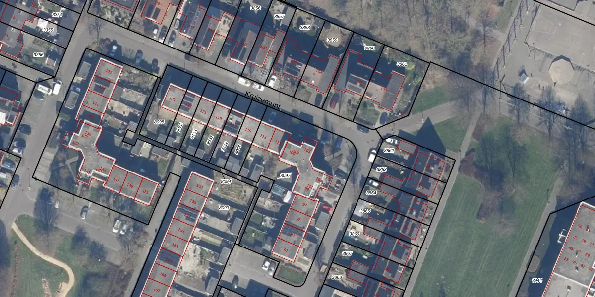 Het perceel waarop Kruizemunt 105 staat heeft een oppervlakte van 1447 m². Dit is een zeer groot perceel. De perceeloppervlakte wordt geregistreerd door het Kadaster. Gedetailleerde informatie over de maten van dit perceel kunt u vinden in het rapport Kadastrale kaart met maatvoering van Kruizemunt 105.