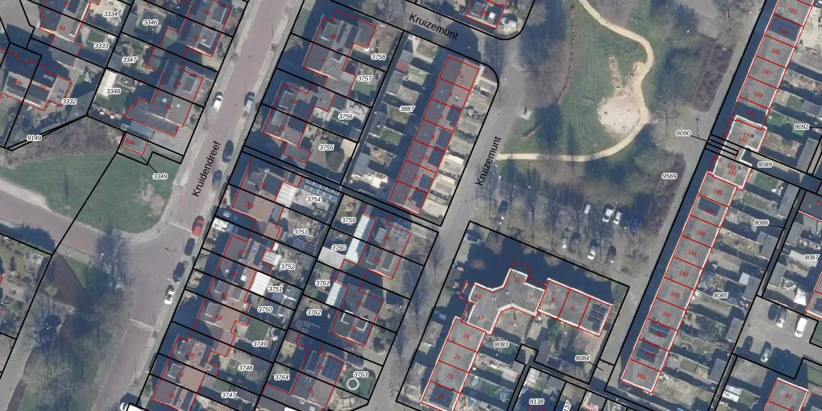 Het perceel waarop Kruizemunt 14 staat heeft een oppervlakte van 1081 m². Dit is een zeer groot perceel. De perceeloppervlakte wordt geregistreerd door het Kadaster. Gedetailleerde informatie over de maten van dit perceel kunt u vinden in het rapport Kadastrale kaart met maatvoering van Kruizemunt 14.