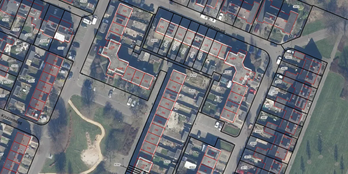 Het perceel waarop Kruizemunt 155 staat heeft een oppervlakte van 3260 m². Dit is een zeer groot perceel. De perceeloppervlakte wordt geregistreerd door het Kadaster. Gedetailleerde informatie over de maten van dit perceel kunt u vinden in het rapport Kadastrale kaart met maatvoering van Kruizemunt 155.