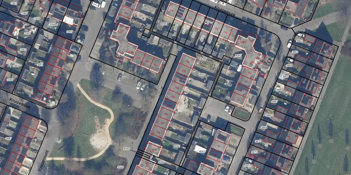 Het perceel waarop Kruizemunt 159 staat heeft een oppervlakte van 3260 m². Dit is een zeer groot perceel. De perceeloppervlakte wordt geregistreerd door het Kadaster. Gedetailleerde informatie over de maten van dit perceel kunt u vinden in het rapport Kadastrale kaart met maatvoering van Kruizemunt 159.