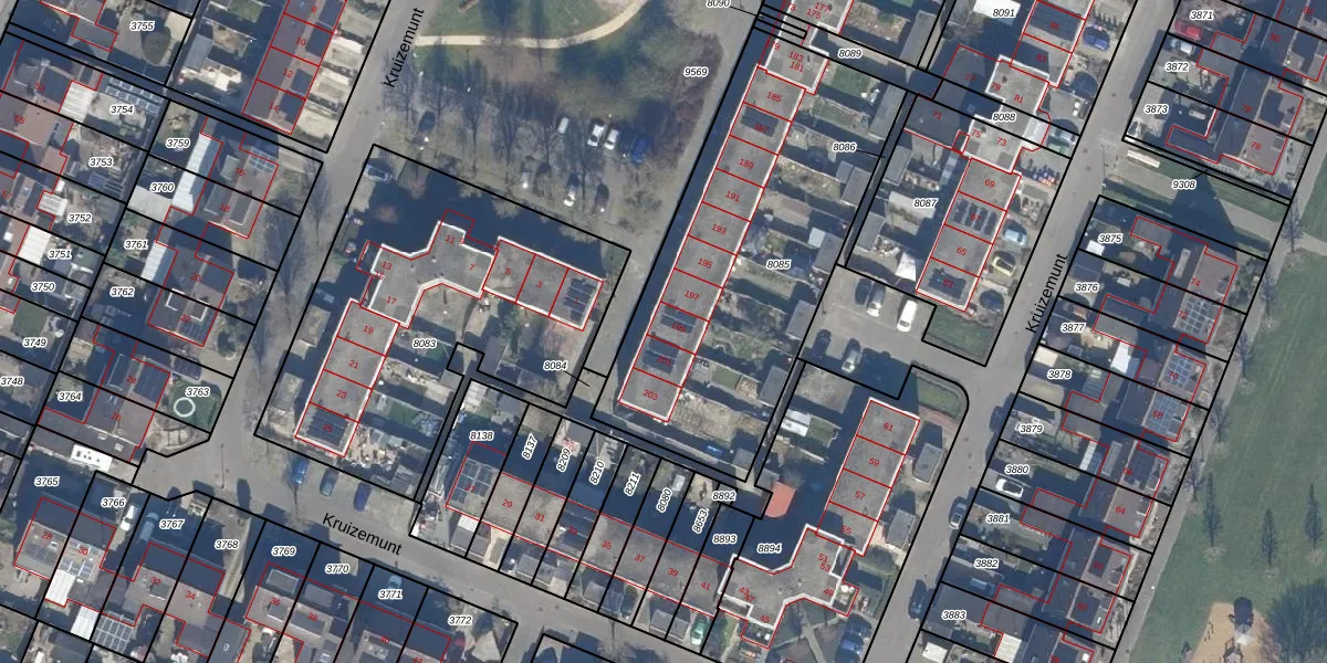 Het perceel waarop Kruizemunt 199 staat heeft een oppervlakte van 1610 m². Dit is een zeer groot perceel. De perceeloppervlakte wordt geregistreerd door het Kadaster. Gedetailleerde informatie over de maten van dit perceel kunt u vinden in het rapport Kadastrale kaart met maatvoering van Kruizemunt 199.