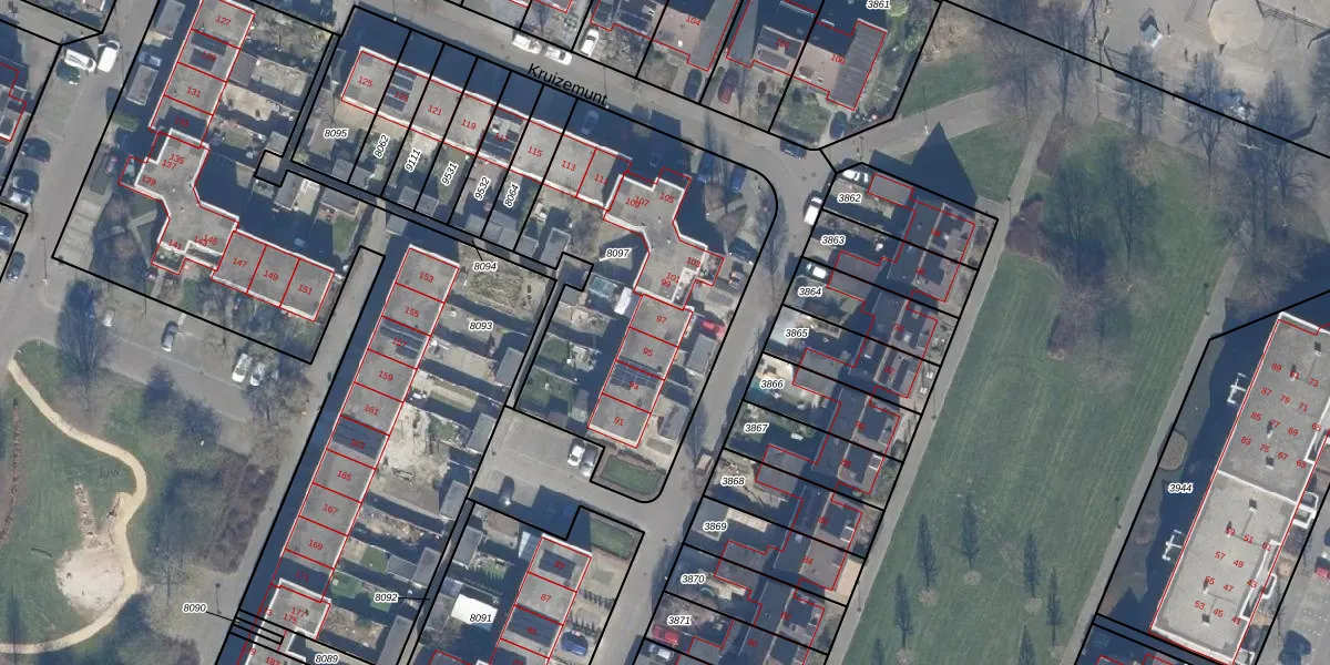 Het perceel waarop Kruizemunt 97 staat heeft een oppervlakte van 1447 m². Dit is een zeer groot perceel. De perceeloppervlakte wordt geregistreerd door het Kadaster. Gedetailleerde informatie over de maten van dit perceel kunt u vinden in het rapport Kadastrale kaart met maatvoering van Kruizemunt 97.