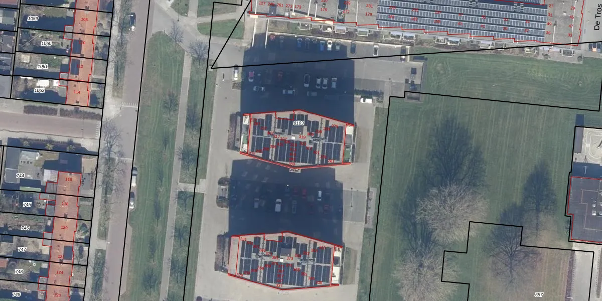 Het adres is gelegen op perceel 8103 in de sectie A en de kadastrale gemeente Dronten. De kadastrale aanduiding is aldus DTN01-A-8103. De gemiddelde perceelgrootte in Dronten is 1,8 ha. Dit perceel is kleiner: de perceeloppervlakte bedraagt 1,4 ha. De grootste perceeloppervlakte in de kadastrale gemeente is 25,03 km². De kleinste oppervlakte bedraagt 0 m². Op het perceel liggen in totaal 93 adressen. De huidige grenzen van het perceel zijn digitaal in de Basisregistratie Kadaster (BRK) geregistreerd op 03-03-2017.