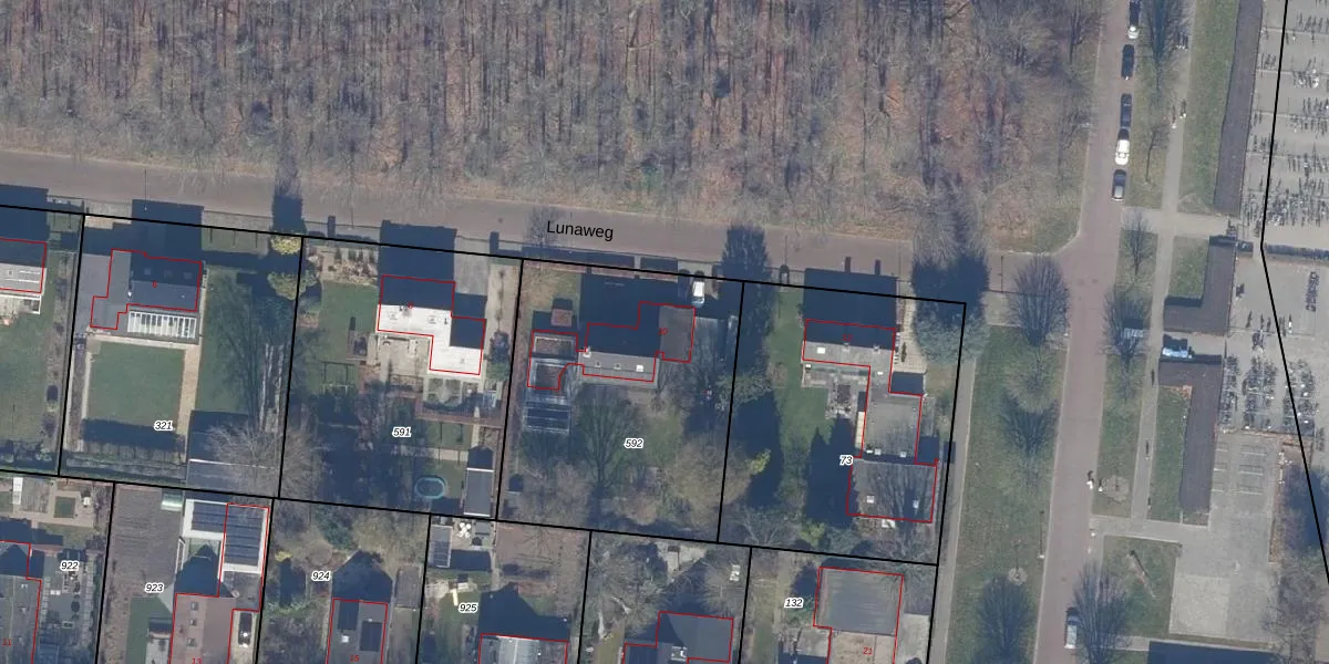 Het perceel waarop Lunaweg 10 staat heeft een oppervlakte van 1320 m². Dit is een zeer groot perceel. De perceeloppervlakte wordt geregistreerd door het Kadaster. Gedetailleerde informatie over de maten van dit perceel kunt u vinden in het rapport Kadastrale kaart met maatvoering van Lunaweg 10.