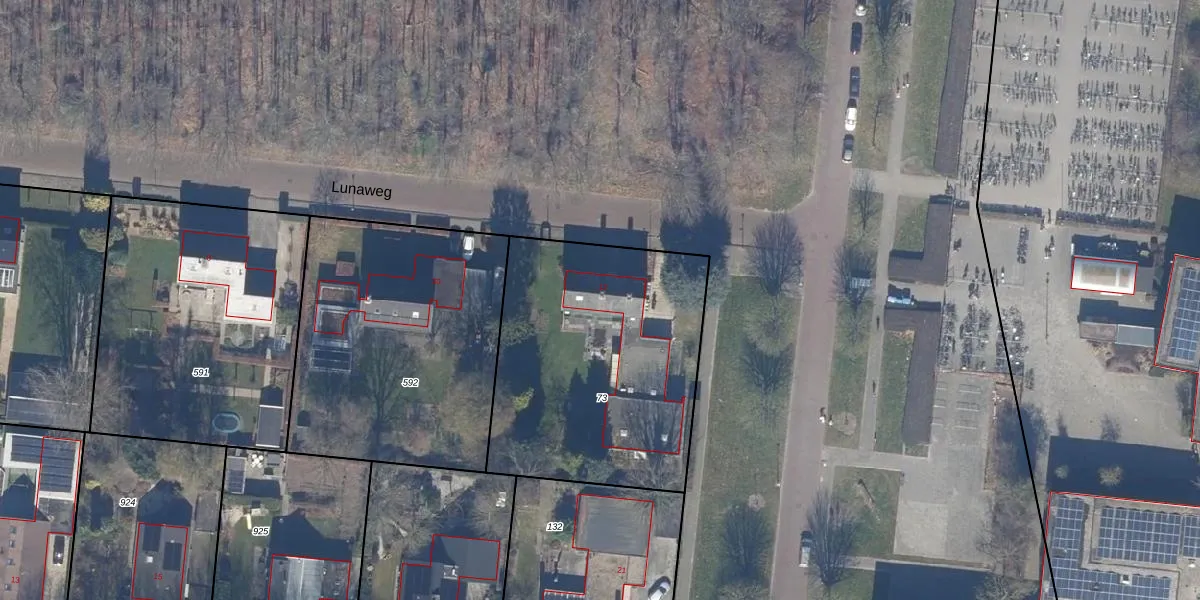 Het perceel waarop Lunaweg 12 staat heeft een oppervlakte van 1326 m². Dit is een zeer groot perceel. De perceeloppervlakte wordt geregistreerd door het Kadaster. Gedetailleerde informatie over de maten van dit perceel kunt u vinden in het rapport Kadastrale kaart met maatvoering van Lunaweg 12.