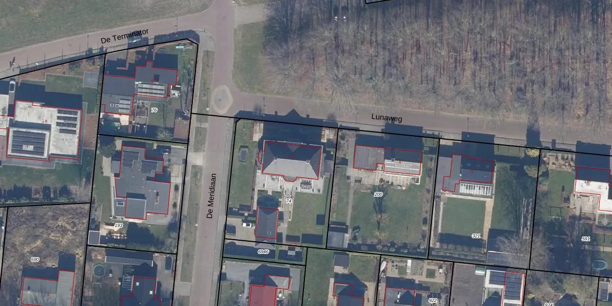 Het perceel waarop Lunaweg 2 staat heeft een oppervlakte van 1320 m². Dit is een zeer groot perceel. De perceeloppervlakte wordt geregistreerd door het Kadaster. Gedetailleerde informatie over de maten van dit perceel kunt u vinden in het rapport Kadastrale kaart met maatvoering van Lunaweg 2.