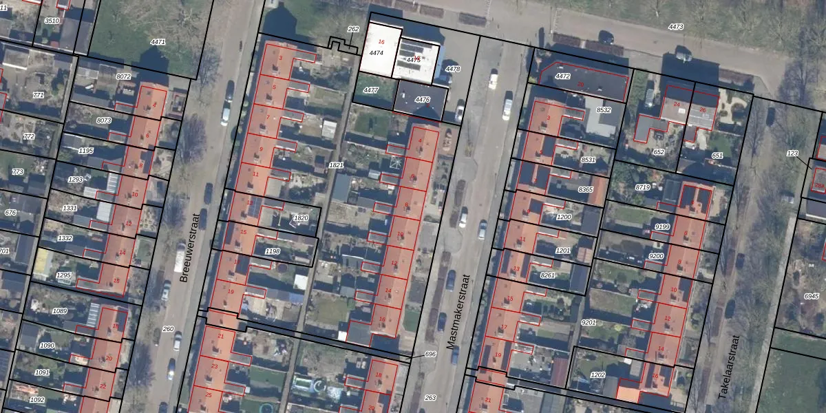 Het perceel waarop Mastmakerstraat 8 staat heeft een oppervlakte van 2963 m². Dit is een zeer groot perceel. De perceeloppervlakte wordt geregistreerd door het Kadaster. Gedetailleerde informatie over de maten van dit perceel kunt u vinden in het rapport Kadastrale kaart met maatvoering van Mastmakerstraat 8.