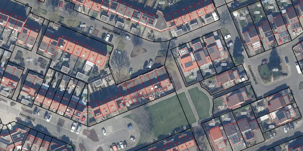 Het perceel waarop Mergelland 23 staat heeft een oppervlakte van 2526 m². Dit is een zeer groot perceel. De perceeloppervlakte wordt geregistreerd door het Kadaster. Gedetailleerde informatie over de maten van dit perceel kunt u vinden in het rapport Kadastrale kaart met maatvoering van Mergelland 23.