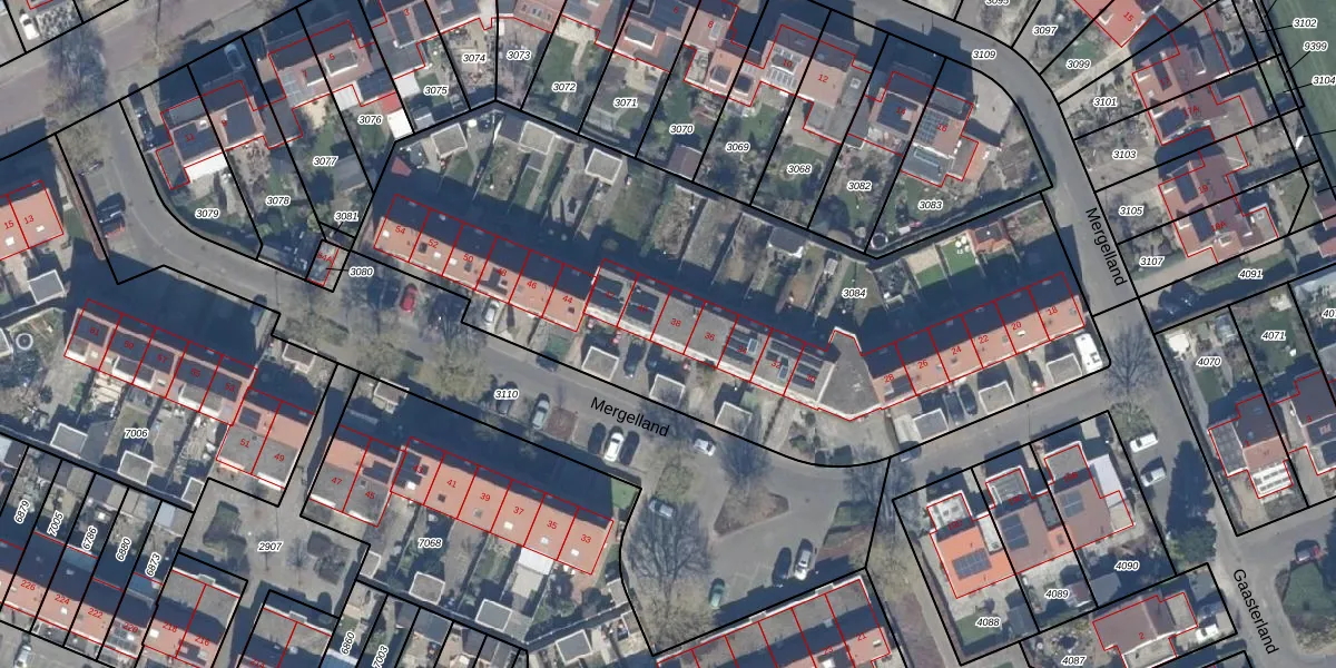 Het perceel waarop Mergelland 38 staat heeft een oppervlakte van 3357 m². Dit is een zeer groot perceel. De perceeloppervlakte wordt geregistreerd door het Kadaster. Gedetailleerde informatie over de maten van dit perceel kunt u vinden in het rapport Kadastrale kaart met maatvoering van Mergelland 38.