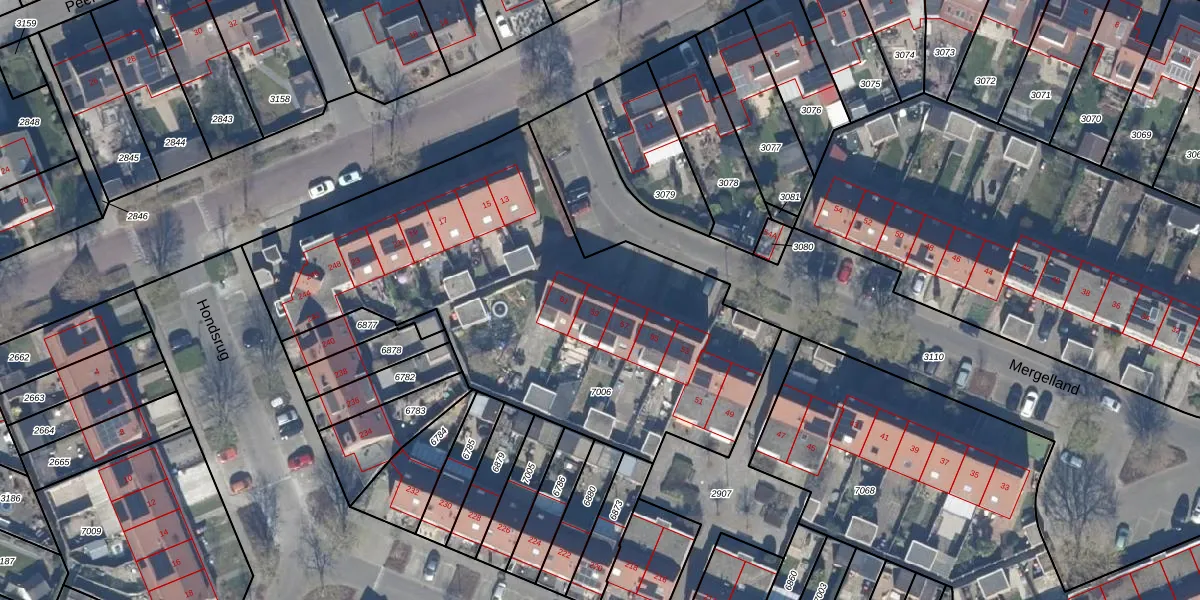 Het perceel waarop Mergelland 59 staat heeft een oppervlakte van 2431 m². Dit is een zeer groot perceel. De perceeloppervlakte wordt geregistreerd door het Kadaster. Gedetailleerde informatie over de maten van dit perceel kunt u vinden in het rapport Kadastrale kaart met maatvoering van Mergelland 59.