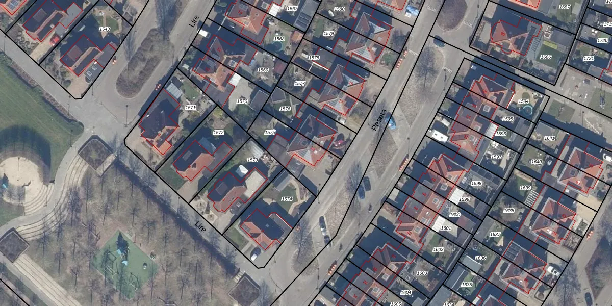 Het perceel waarop Peseta 23 staat heeft een oppervlakte van 364 m². Dit is een groot perceel. De perceeloppervlakte wordt geregistreerd door het Kadaster. Gedetailleerde informatie over de maten van dit perceel kunt u vinden in het rapport Kadastrale kaart met maatvoering van Peseta 23.
