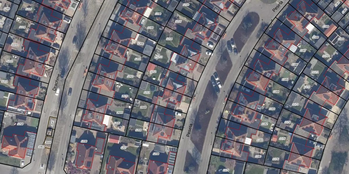 Het perceel waarop Peseta 9 staat heeft een oppervlakte van 323 m². Dit is een groot perceel. De perceeloppervlakte wordt geregistreerd door het Kadaster. Gedetailleerde informatie over de maten van dit perceel kunt u vinden in het rapport Kadastrale kaart met maatvoering van Peseta 9.