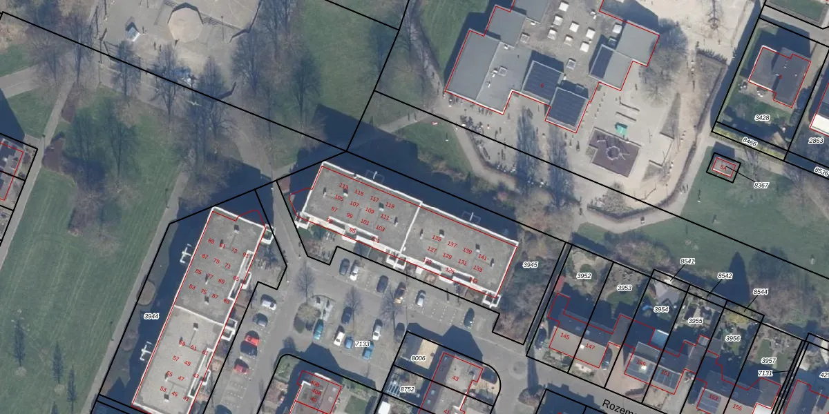 Het perceel waarop Rozemarijn 119 staat heeft een oppervlakte van 1503 m². Dit is een zeer groot perceel. De perceeloppervlakte wordt geregistreerd door het Kadaster. Gedetailleerde informatie over de maten van dit perceel kunt u vinden in het rapport Kadastrale kaart met maatvoering van Rozemarijn 119.