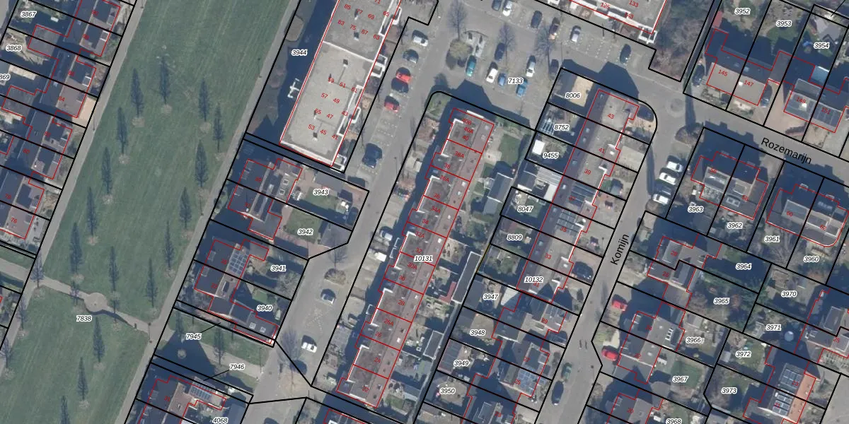 Het perceel waarop Rozemarijn 34 staat heeft een oppervlakte van 2142 m². Dit is een zeer groot perceel. De perceeloppervlakte wordt geregistreerd door het Kadaster. Gedetailleerde informatie over de maten van dit perceel kunt u vinden in het rapport Kadastrale kaart met maatvoering van Rozemarijn 34.