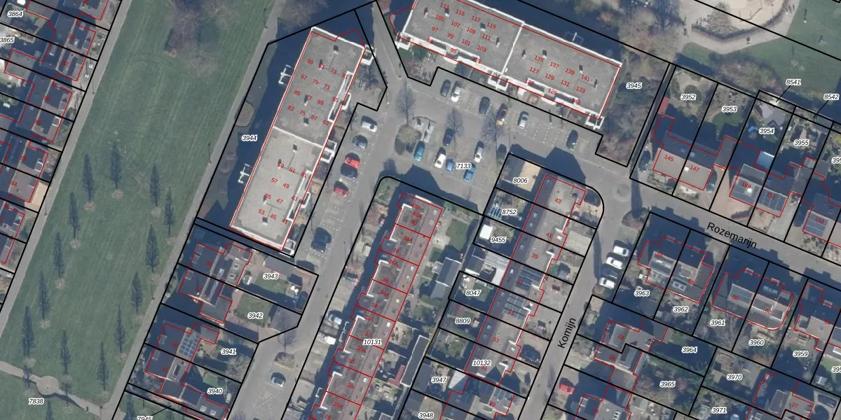 Het perceel waarop Rozemarijn 40-B staat heeft een oppervlakte van 2142 m². Dit is een zeer groot perceel. De perceeloppervlakte wordt geregistreerd door het Kadaster. Gedetailleerde informatie over de maten van dit perceel kunt u vinden in het rapport Kadastrale kaart met maatvoering van Rozemarijn 40-B.