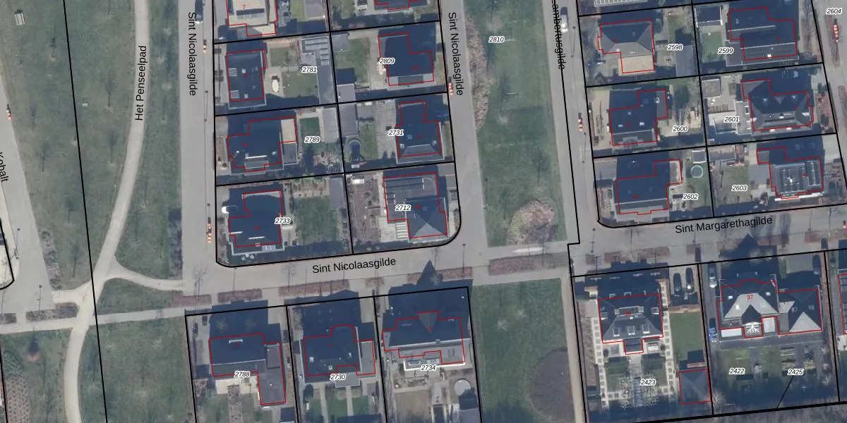 Het perceel waarop Sint Nicolaasgilde 15 staat heeft een oppervlakte van 500 m². Dit is een groot perceel. De perceeloppervlakte wordt geregistreerd door het Kadaster. Gedetailleerde informatie over de maten van dit perceel kunt u vinden in het rapport Kadastrale kaart met maatvoering van Sint Nicolaasgilde 15.