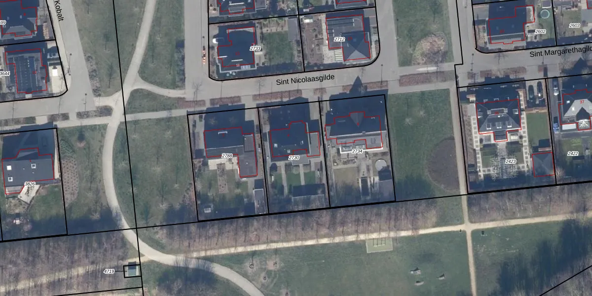 Het perceel waarop Sint Nicolaasgilde 4 staat heeft een oppervlakte van 750 m². Dit is een groot perceel. De perceeloppervlakte wordt geregistreerd door het Kadaster. Gedetailleerde informatie over de maten van dit perceel kunt u vinden in het rapport Kadastrale kaart met maatvoering van Sint Nicolaasgilde 4.