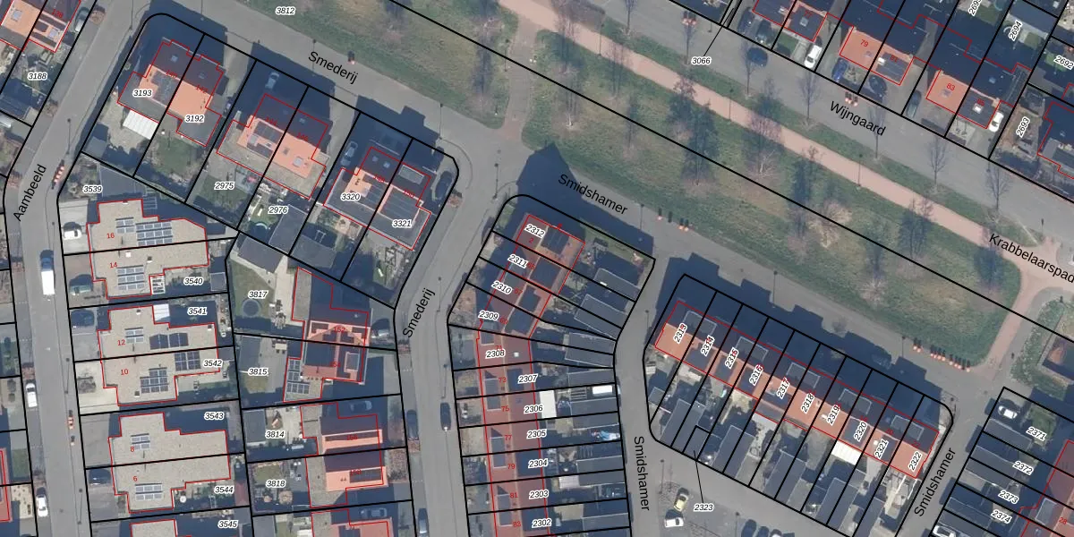 Het perceel waarop Smederij 65 staat heeft een oppervlakte van 164 m². Dit is een middelgroot perceel. De perceeloppervlakte wordt geregistreerd door het Kadaster. Gedetailleerde informatie over de maten van dit perceel kunt u vinden in het rapport Kadastrale kaart met maatvoering van Smederij 65.