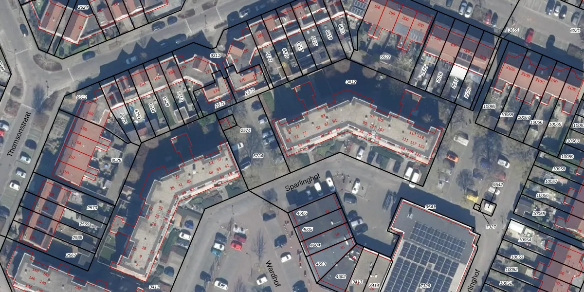Het perceel waarop Sparlinghof 63 staat heeft een oppervlakte van 1838 m². Dit is een zeer groot perceel. De perceeloppervlakte wordt geregistreerd door het Kadaster. Gedetailleerde informatie over de maten van dit perceel kunt u vinden in het rapport Kadastrale kaart met maatvoering van Sparlinghof 63.