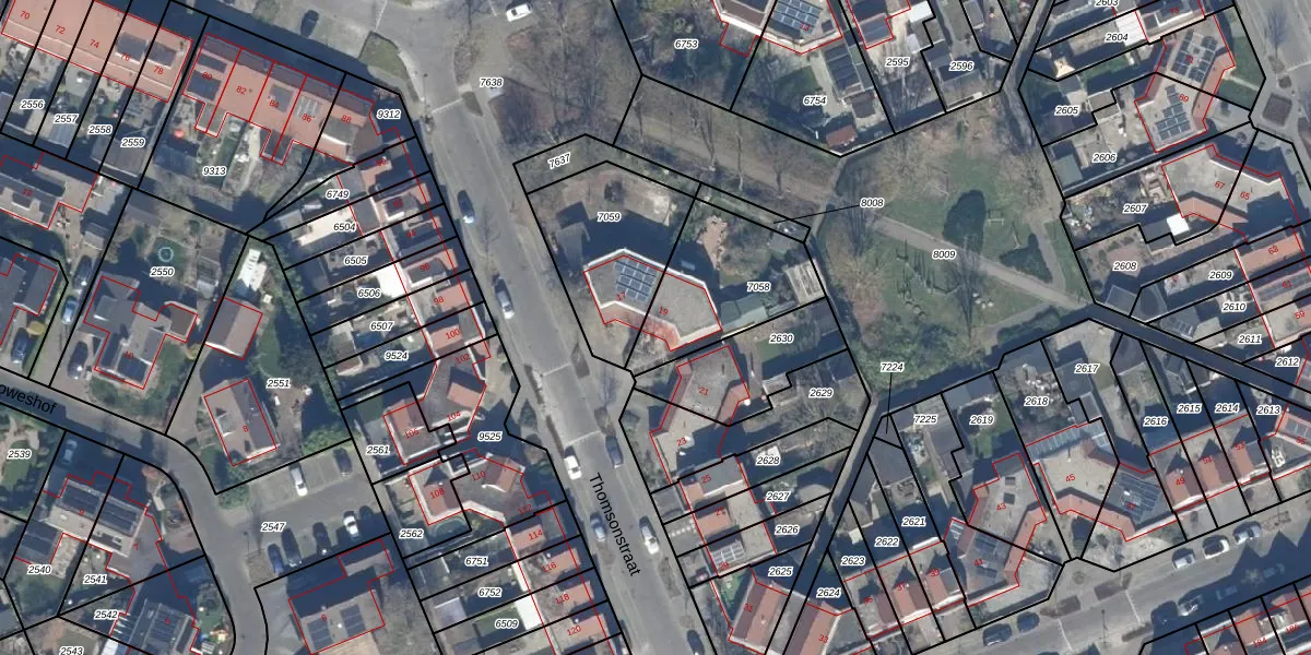 Het perceel waarop Thomsonstraat 19 staat heeft een oppervlakte van 425 m². Dit is een groot perceel. De perceeloppervlakte wordt geregistreerd door het Kadaster. Gedetailleerde informatie over de maten van dit perceel kunt u vinden in het rapport Kadastrale kaart met maatvoering van Thomsonstraat 19.