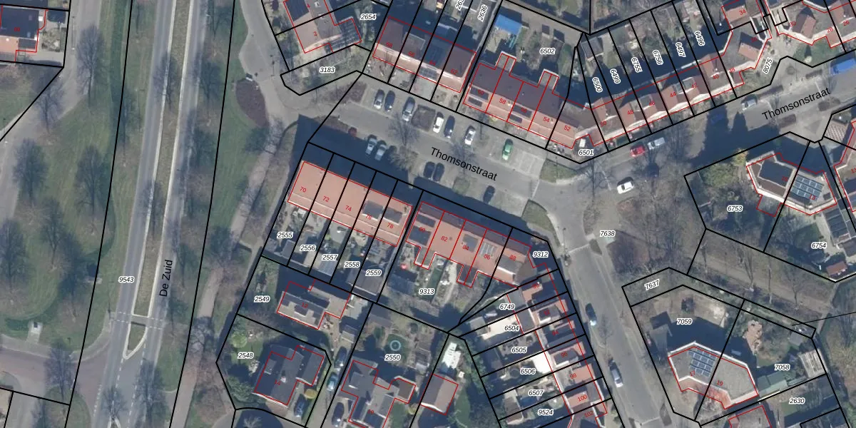 Het perceel waarop Thomsonstraat 80 staat heeft een oppervlakte van 624 m². Dit is een groot perceel. De perceeloppervlakte wordt geregistreerd door het Kadaster. Gedetailleerde informatie over de maten van dit perceel kunt u vinden in het rapport Kadastrale kaart met maatvoering van Thomsonstraat 80.