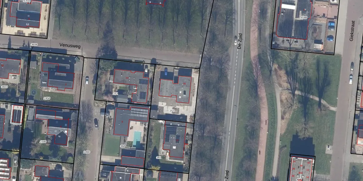Het perceel waarop Venusweg 16 staat heeft een oppervlakte van 748 m². Dit is een groot perceel. De perceeloppervlakte wordt geregistreerd door het Kadaster. Gedetailleerde informatie over de maten van dit perceel kunt u vinden in het rapport Kadastrale kaart met maatvoering van Venusweg 16.