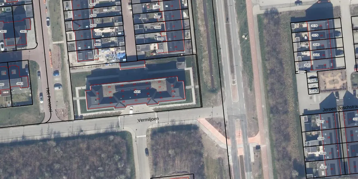 Het perceel waarop Vermiljoen 2-P staat heeft een oppervlakte van 2101 m². Dit is een zeer groot perceel. De perceeloppervlakte wordt geregistreerd door het Kadaster. Gedetailleerde informatie over de maten van dit perceel kunt u vinden in het rapport Kadastrale kaart met maatvoering van Vermiljoen 2-P.