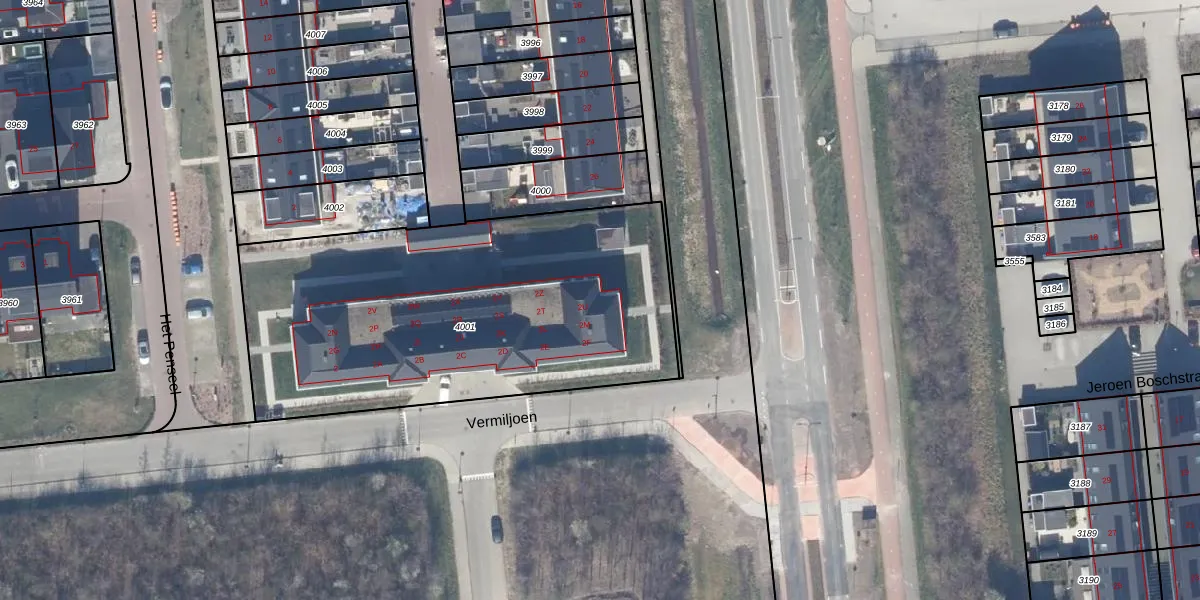 Het perceel waarop Vermiljoen 2-Q staat heeft een oppervlakte van 2101 m². Dit is een zeer groot perceel. De perceeloppervlakte wordt geregistreerd door het Kadaster. Gedetailleerde informatie over de maten van dit perceel kunt u vinden in het rapport Kadastrale kaart met maatvoering van Vermiljoen 2-Q.